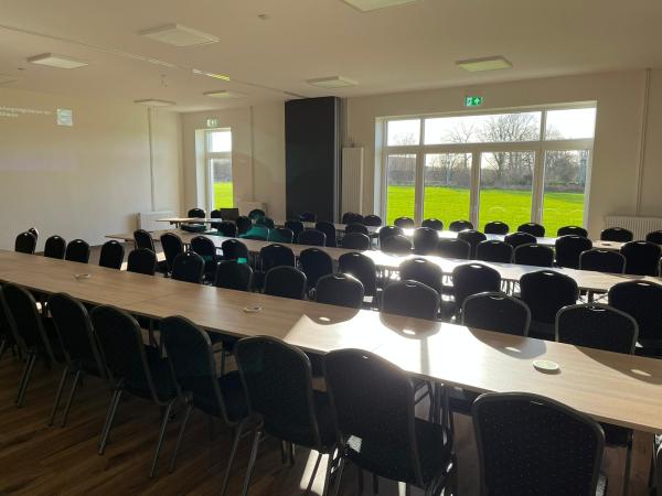 Für größere Veranstaltungen kann bei Bedarf ein Zelt an der rechten Seite angebaut werden. Hierfür ist eine extra Seiteneingangstür integriert. Das Zelt muss dann jedoch extern gebucht werden.